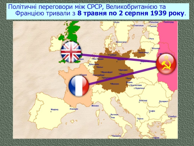 Слайд 15Політичні переговори між СРСР, Великобританією та Францією тривали з 8