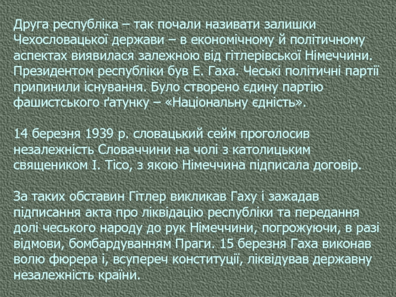 14 березня 1939 р. словацький сейм проголосив незалежність Словаччини на чолі з католицьким священиком І. Тісо, з якою Німеччина підписала договір.