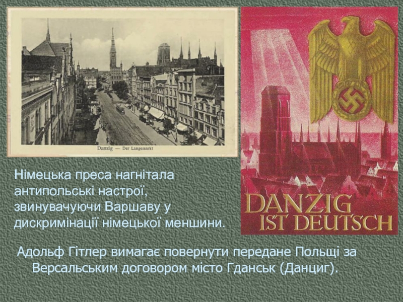 Слайд 12Адольф Гітлер вимагає повернути передане Польщі за Версальським договором місто