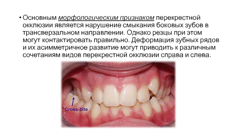 Слайд 12Основным морфологическим признаком перекрестной окклюзии является нарушение смыкания боковых зубов