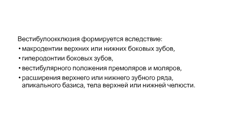 Слайд 10Вестибулоокклюзия формируется в результате увеличения размера верхнего или нижнего зубного