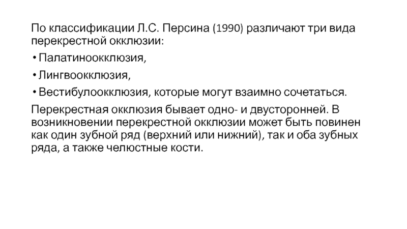 Слайд 4По классификации Л.С. Персина (1990) различают три вида перекрестной окклюзии: