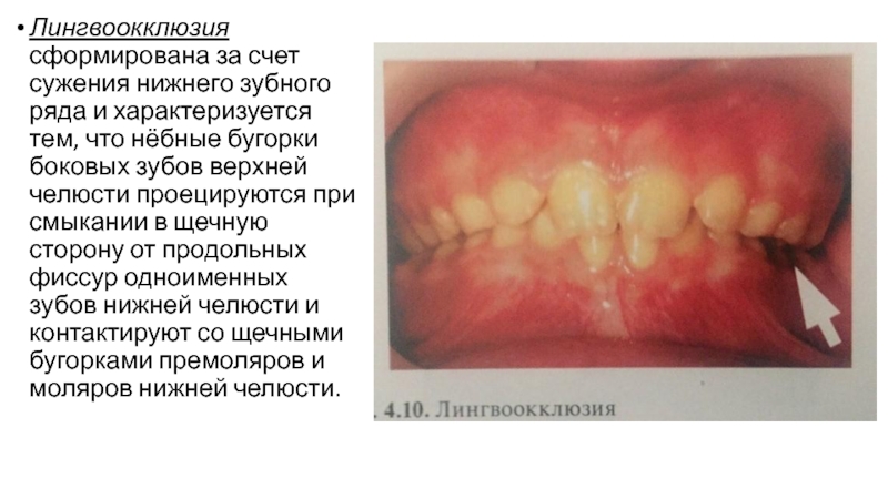 Слайд 8Лингвоокклюзия сформирована за счет сужения нижнего зубного ряда и характеризуется