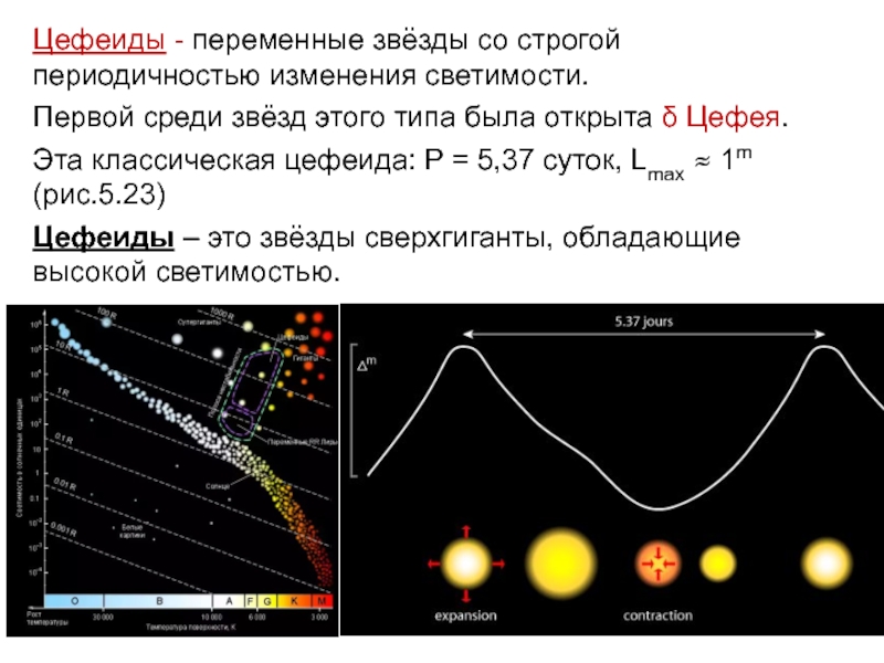 Рис. 5.24. Графики изменения светимости, лучевой скорости и температуры цефеид.