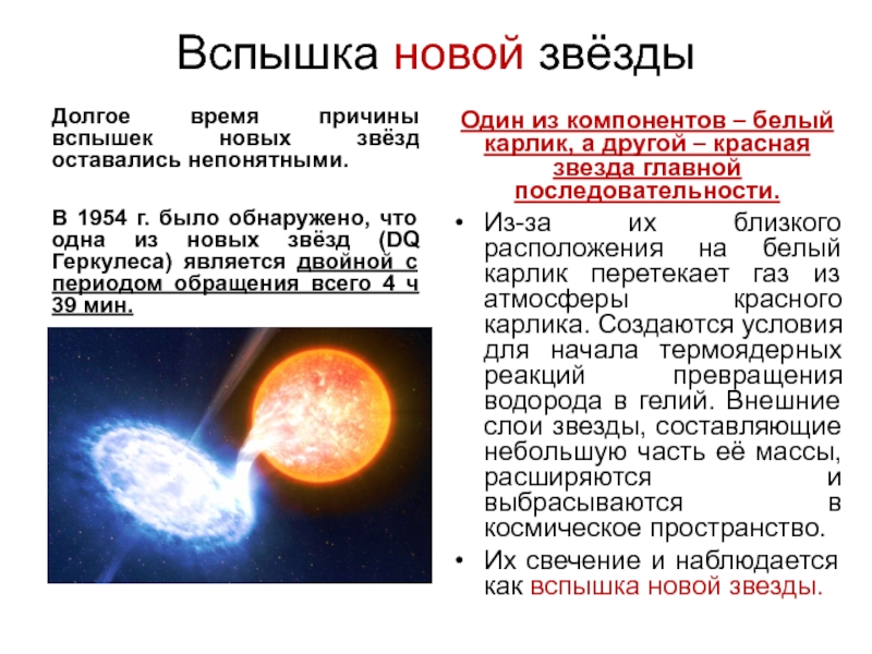 Из-за их близкого расположения на белый карлик перетекает газ из атмосферы красного карлика. Создаются условия для начала термоядерных реакций превращения водорода в гелий. Внешние слои звезды, составляющие небольшую часть её массы, расширяются и выбрасываются в космическое пространство.