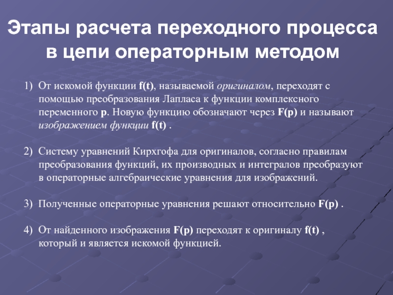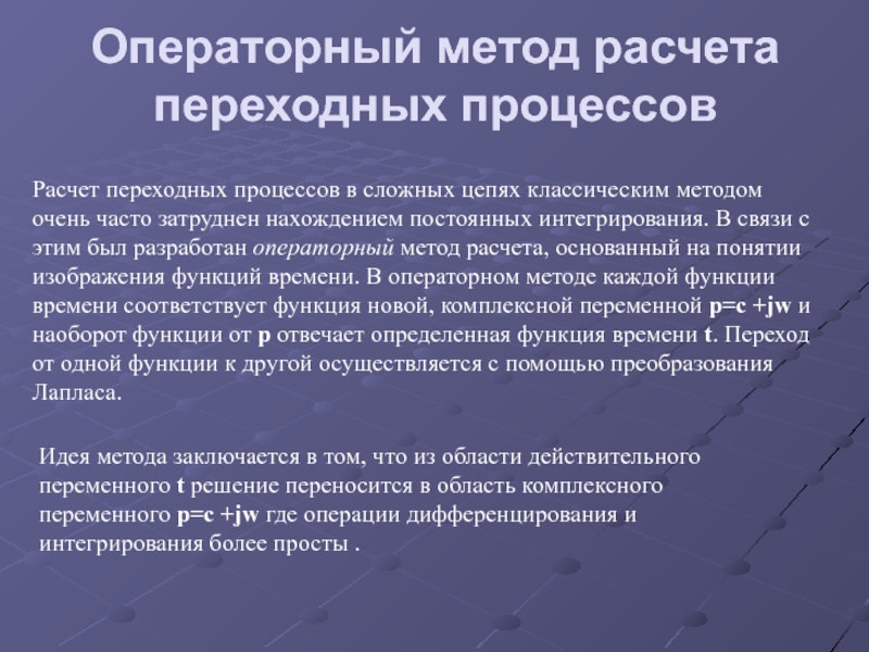 Идея метода заключается в том, что из области действительного переменного t решение переносится в область комплексного переменного p=c +jw где операции дифференцирования и интегрирования более просты .