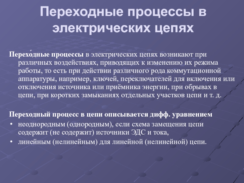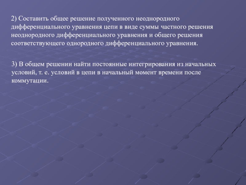 1) Составить систему уравнений на основе законов Кирхгофа, Ома, электромагнитной индукции и т.д., описывающих состояние цепи после коммутации, и исключением переменных получить одно дифференциальное уравнение, в общем случае неоднородное относительно искомого тока i или напряжения u. Для простых цепей получается дифференциальное уравнение первого или второго порядка, в котором в качестве искомой величины выбирают либо ток в индуктивном элементе, либо напряжение на емкостном элементе
