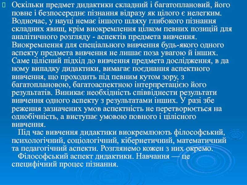Слайд 5Оскільки предмет дидактики складний і багатоплановий, його повне і безпосереднє