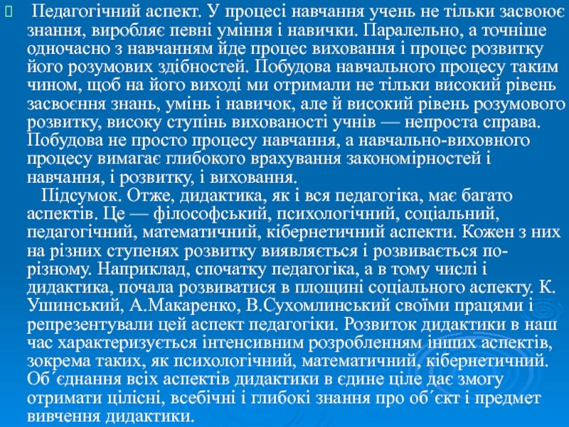 Підсумок. Отже, дидактика, як і вся педагогіка, має багато аспектів. Це — філософський, психологічний, соціальний, педагогічний, математичний, кібернетичний аспекти. Кожен з них на різних ступенях розвитку виявляється і розвивається по-різному. Наприклад, спочатку педагогіка, а в тому числі і дидактика, почала розвиватися в площині соціального аспекту. К.Ушинський, А.Макаренко, В.Сухомлинський своїми працями і репрезентували цей аспект педагогіки. Розвиток дидактики в наш час характеризується інтенсивним розробленням інших аспектів, зокрема таких, як психологічний, математичний, кібернетичний. Об´єднання всіх аспектів дидактики в єдине ціле дає змогу отримати цілісні, всебічні і глибокі знання про об´єкт і предмет вивчення дидактики.