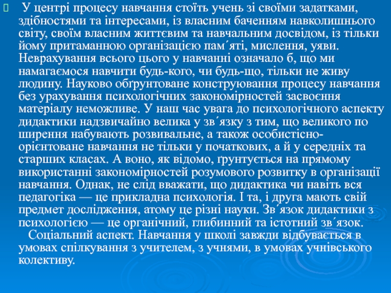 та навчальним досвідом, із тільки йому притаманною організацією пам´яті, мислення, уяви. Неврахування всього цього у навчанні означало б, що ми намагаємося навчити будь-кого, чи будь-що, тільки не живу людину. Науково обґрунтоване конструювання процесу навчання без урахування психологічних закономірностей засвоєння матеріалу неможливе. У наш час увага до психологічного аспекту дидактики надзвичайно велика у зв´язку з тим, що великого поширення набувають розвивальне, а також особистісно-орієнтоване навчання не тільки у початкових, а й у середніх та старших класах. А воно, як відомо, ґрунтується на прямому використанні закономірностей розумового розвитку в організації навчання. Однак, не слід вважати, що дидактика чи навіть вся педагогіка — це прикладна психологія. І та, і друга мають свій предмет дослідження, атому це різні науки. Зв´язок дидактики з психологією — це органічний, глибинний та істотний зв´язок.