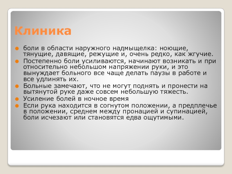 надмыщелок, а также при сгибании и пронации предплечья. Боль иррадиирует