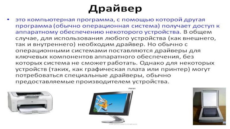Обычно с операционными системами поставляются драйверы для ключевых компонентов аппаратного обеспечения, без которых система не сможет работать. Однако для некоторых устройств (таких, как видеокарта или принтер) могут потребоваться специальные драйверы, обычно предоставляемые производителем устройства.