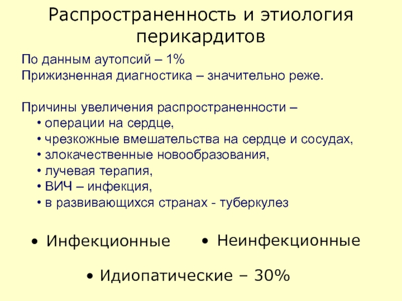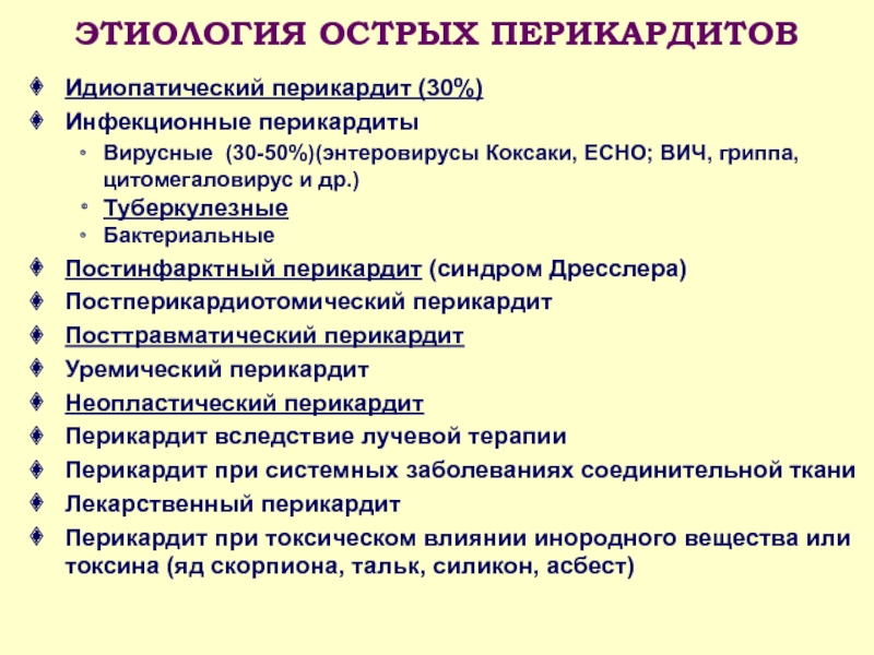 Слайд 6ЭТИОЛОГИЯ ОСТРЫХ ПЕРИКАРДИТОВ
