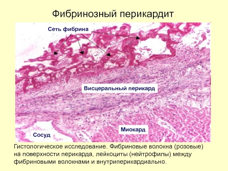 лейкоциты (нейтрофилы) между фибриновыми волокнами и внутриперикардиально.