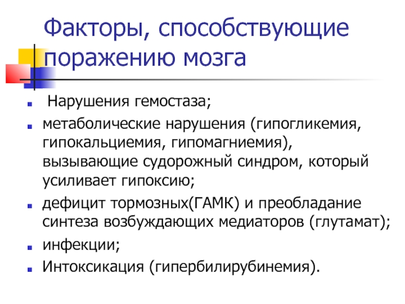 Слайд 20Факторы, способствующие поражению мозга