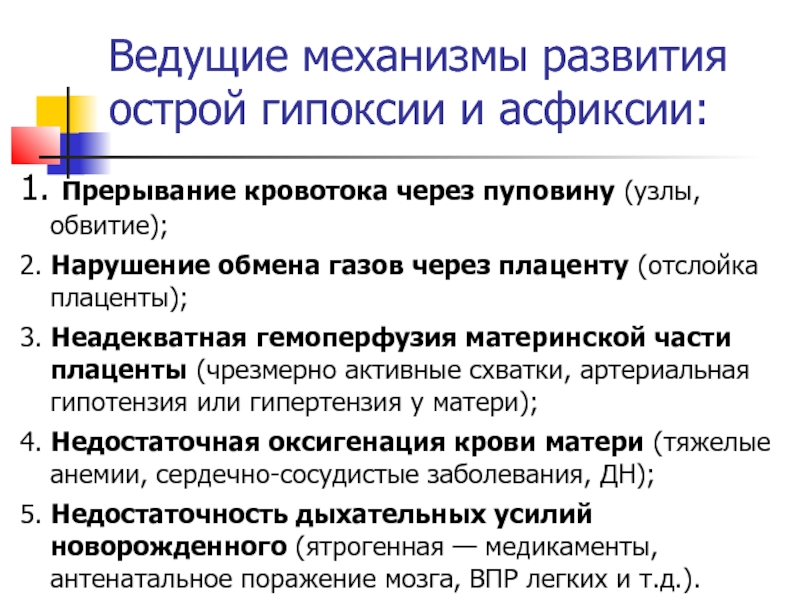 Слайд 11Ведущие механизмы развития острой гипоксии и асфиксии: