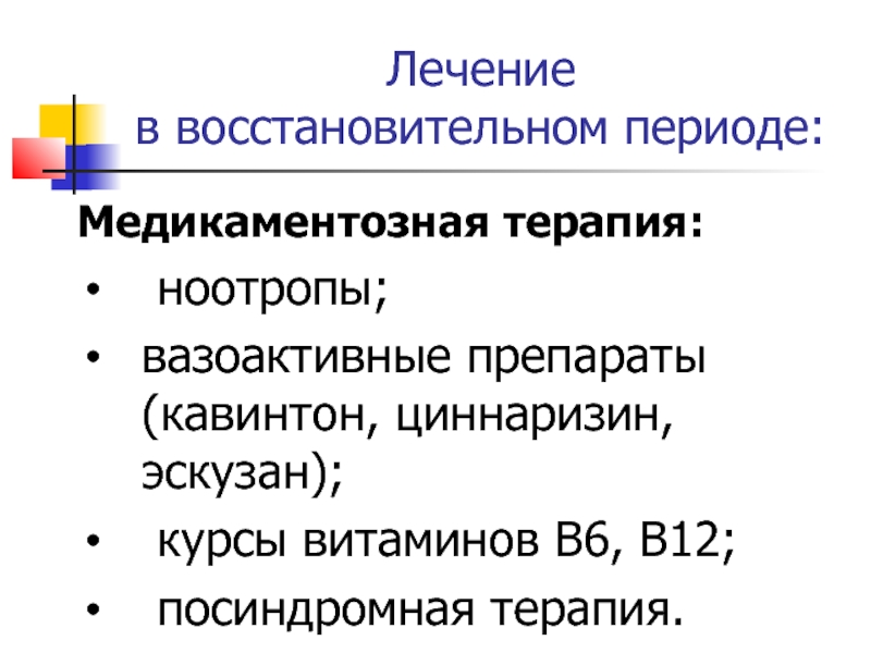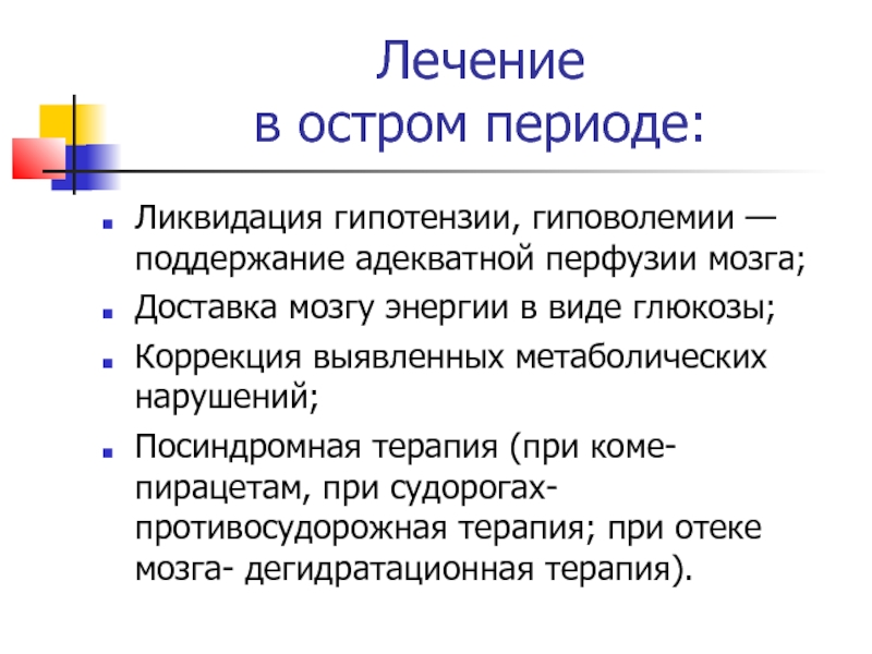 (при коме-пирацетам, при судорогах-противосудорожная терапия; при отеке мозга- дегидратационная терапия).