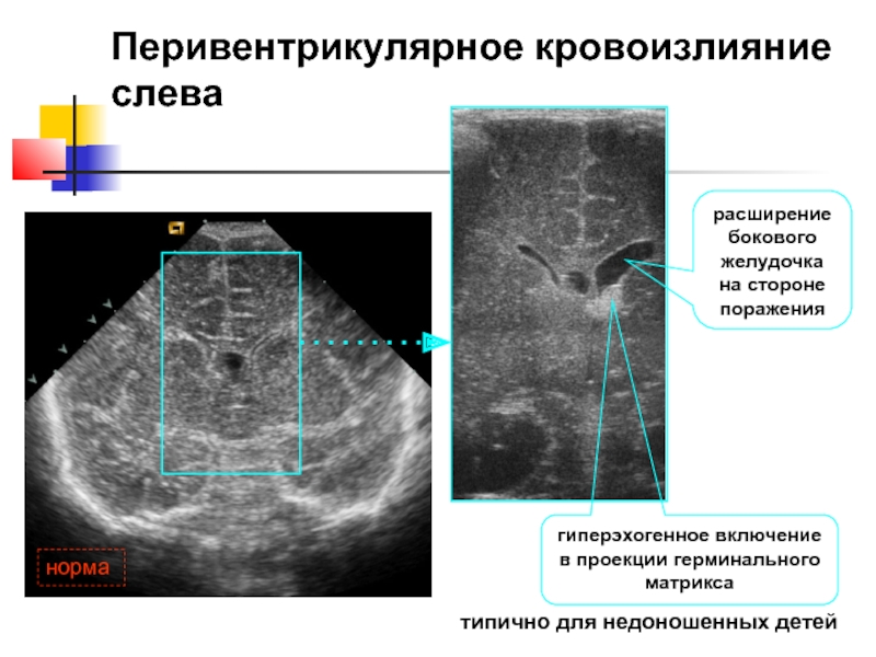 Слайд 36Перивентрикулярное кровоизлияние слева