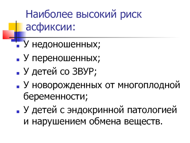 Слайд 12Наиболее высокий риск асфиксии: