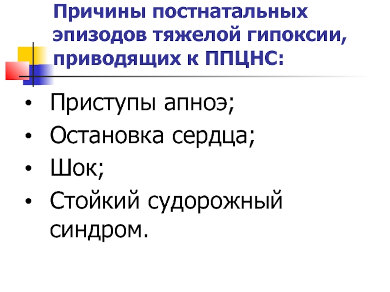 Слайд 13Причины постнатальных эпизодов тяжелой гипоксии, приводящих к ППЦНС: