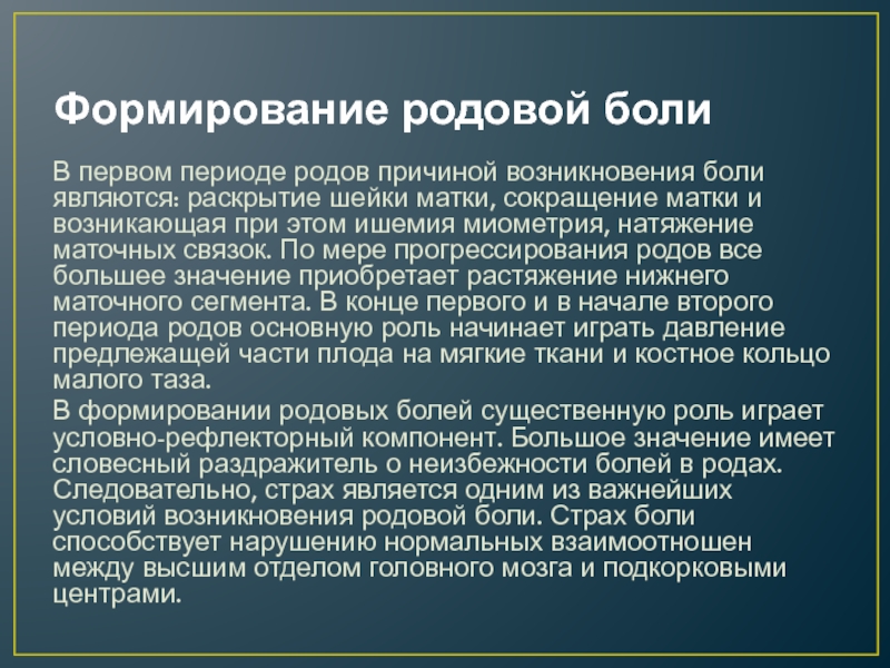 В формировании родовых болей существенную роль играет условно-рефлекторный компонент. Большое значение имеет словесный раздражитель о неизбежности болей в родах. Следовательно, страх является одним из важнейших условий возникновения родовой боли. Страх боли способствует нарушению нормальных взаимоотношен между высшим отделом головного мозга и подкорковыми центрами.