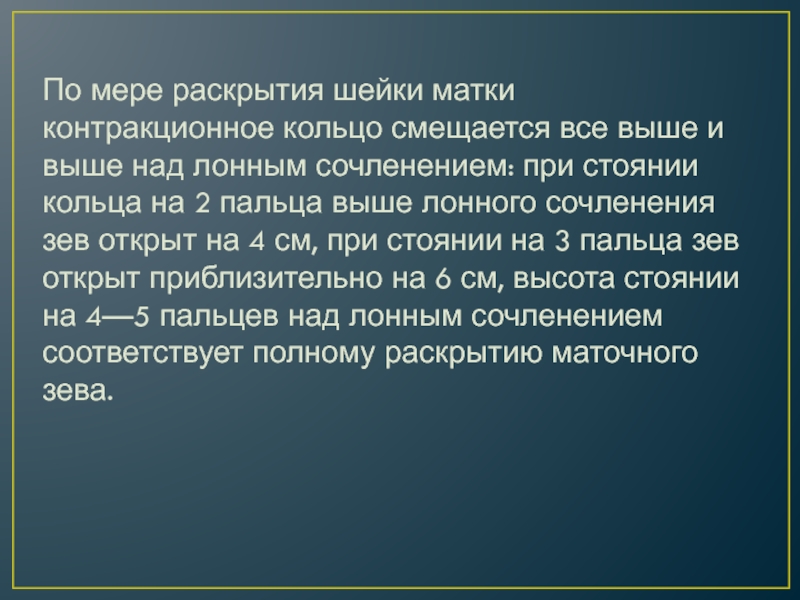 пальца выше лонного сочленения зев открыт на 4 см, при стоянии на 3 пальца зев открыт приблизительно на 6 см, высота стоянии на 4—5 пальцев над лонным сочленением соответствует полному раскрытию маточного зева.