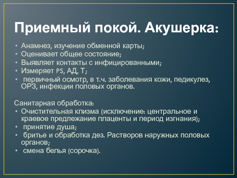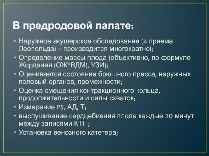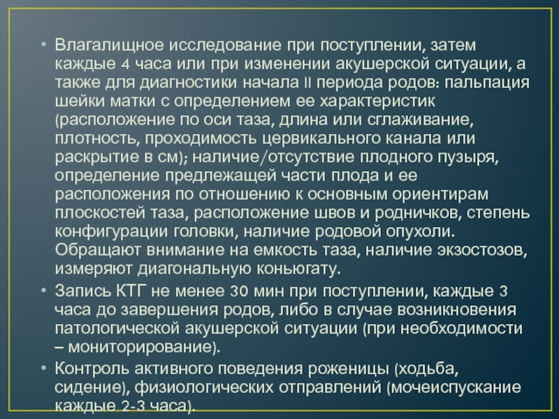 Слайд 20Влагалищное исследование при поступлении, затем каждые 4 часа или при