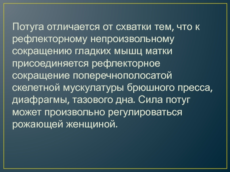 Слайд 14Потуга отличается от схватки тем, что к рефлекторному непроизвольному сокращению
