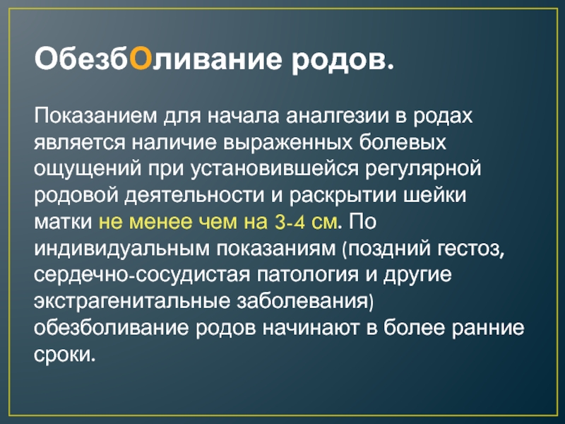 матки не менее чем на 3-4 см. По индивидуальным показаниям (поздний гестоз, сердечно-сосудистая патология и другие экстрагенитальные заболевания) обезболивание родов начинают в более ранние сроки.