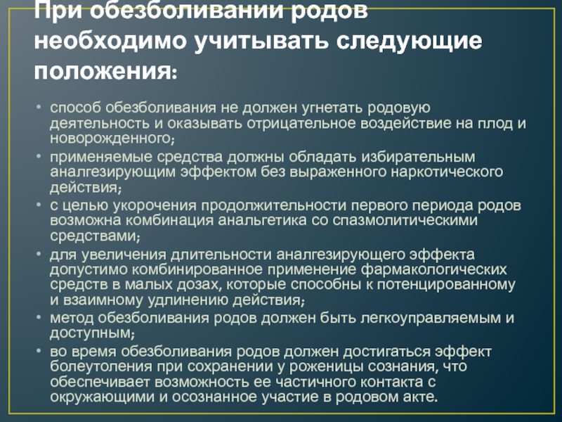 Слайд 26При обезболивании родов необходимо учитывать следующие положения: