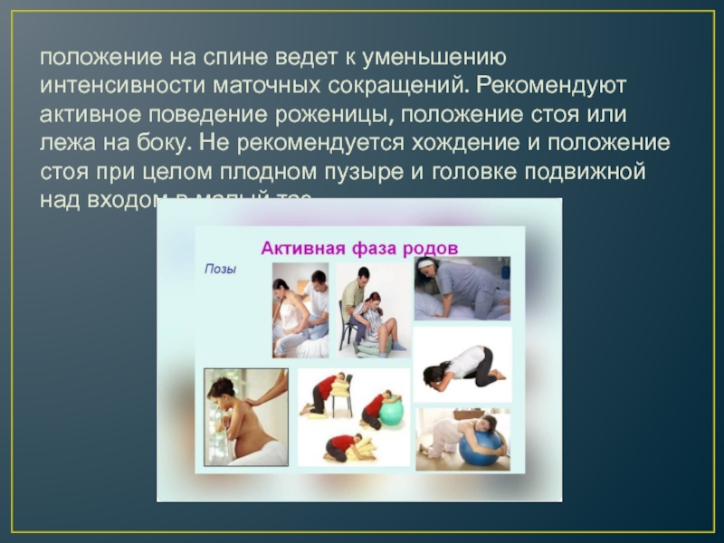 Слайд 22положение на спине ведет к уменьшению интенсивности маточных сокращений. Рекомендуют