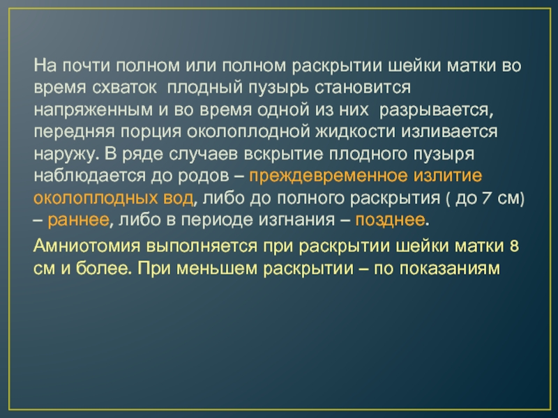 них разрывается, передняя порция околоплодной жидкости изливается наружу. В ряде случаев вскрытие плодного пузыря наблюдается до родов – преждевременное излитие околоплодных вод, либо до полного раскрытия ( до 7 см) – раннее, либо в периоде изгнания – позднее.