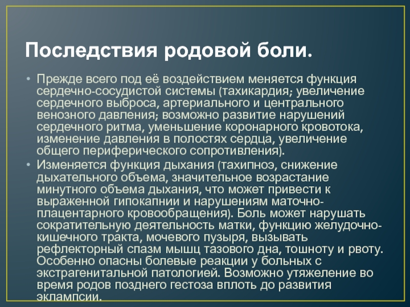 Изменяется функция дыхания (тахипноэ, снижение дыхательного объема, значительное возрастание минутного объема дыхания, что может привести к выраженной гипокапнии и нарушениям маточно-плацентарного кровообращения). Боль может нарушать сократительную деятельность матки, функцию желудочно-кишечного тракта, мочевого пузыря, вызывать рефлекторный спазм мышц тазового дна, тошноту и рвоту. Особенно опасны болевые реакции у больных с экстрагенитальной патологией. Возможно утяжеление во время родов позднего гестоза вплоть до развития эклампсии.