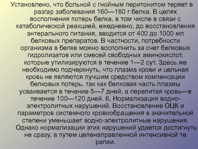 Слайд 67Установлено, что больной с гнойным перитонитом теряет в разгар заболевания