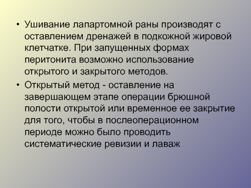клетчатке. При запущенных формах перитонита возможно использование открытого и закрытого