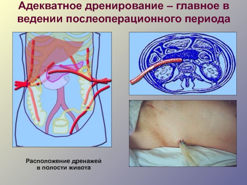 Слайд 54Адекватное дренирование – главное в ведении послеоперационного периода