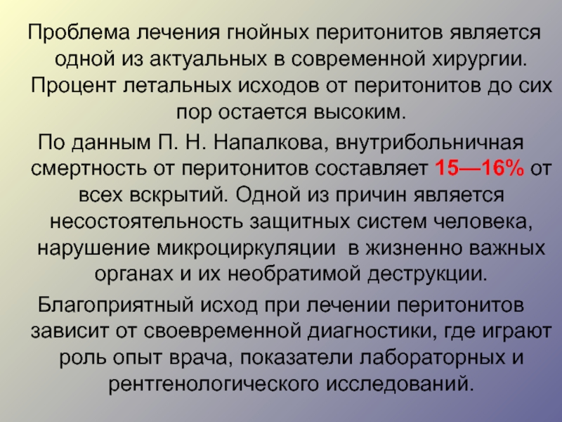 Слайд 2 Проблема лечения гнойных перитонитов является одной из актуальных в