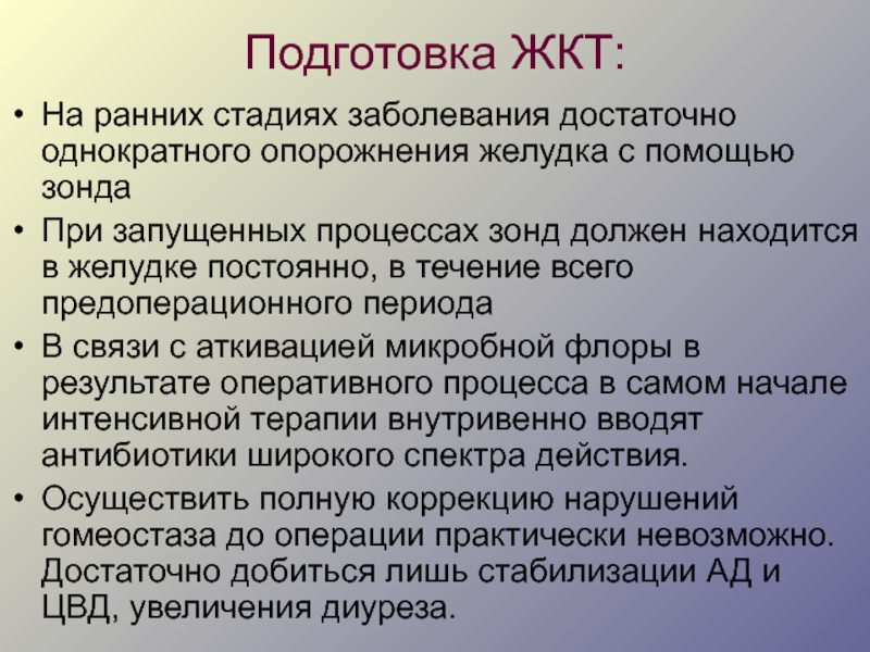 Зондовая коррекция энтеральной среды, включающая декомпрессию, кишечный лаваж, энтеросорбцию и ранее энтеральное питание приводит к раннему восстановлению функциональной активности ЖКТ, снижает проницаемости кишечного барьера для микрофлоры и токсинов.