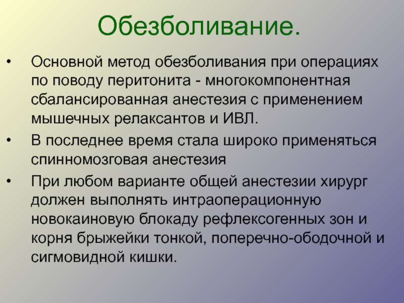 пролонгированная эпидуральная анальгезия местными анестетиками, наркотическими анальгетиками, иглорефлексоанальгезия.