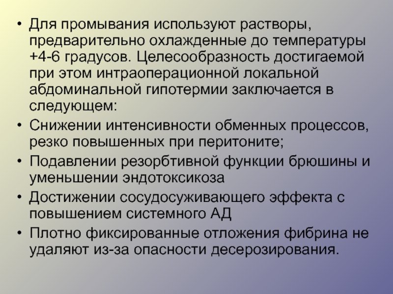 Слайд 51Для промывания используют растворы, предварительно охлажденные до температуры +4-6 градусов.