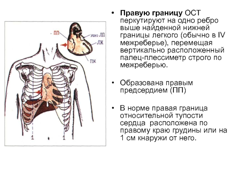 Слайд 11Верхнюю границу ОСТ, определяют, перкутируя сверху вниз, отступя на 1