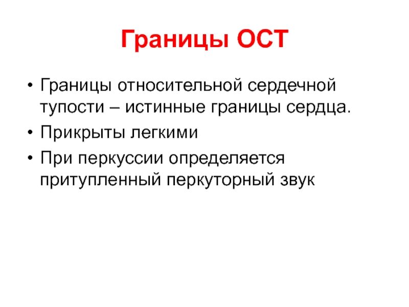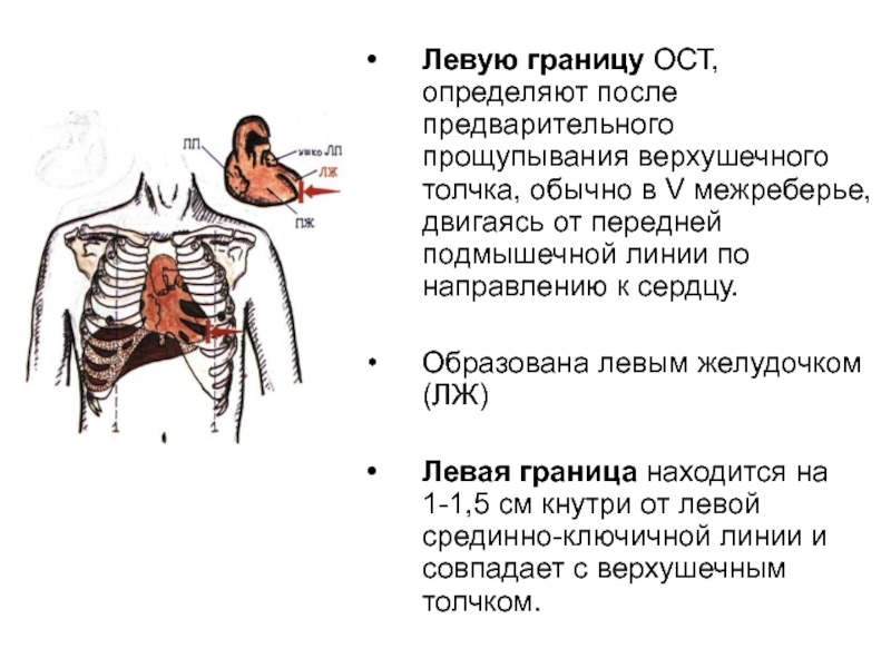 Слайд 10Левую границу ОСТ, определяют после предварительного прощупывания верхушечного толчка, обычно
