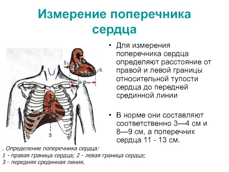 В норме они составляют соответственно 3—4 см и 8—9 см, а поперечник сердца 11 - 13 см.