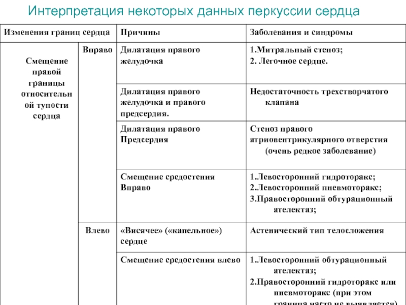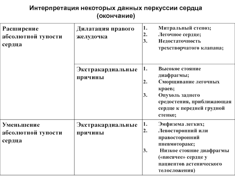Слайд 25Интерпретация некоторых данных перкуссии сердца(окончание)