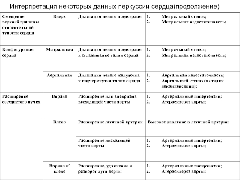 Слайд 24Интерпретация некоторых данных перкуссии сердца(продолжение)