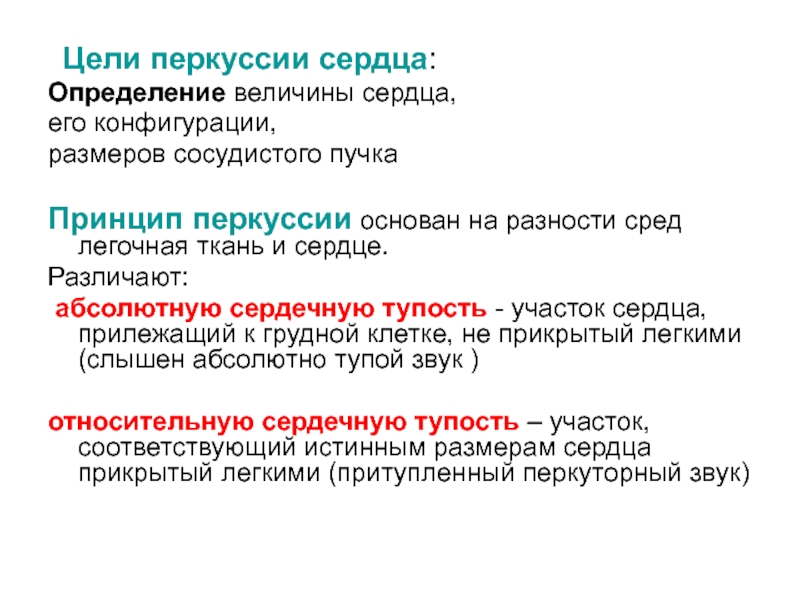 сердечную тупость - участок сердца, прилежащий к грудной клетке, не прикрытый легкими (слышен абсолютно тупой звук )