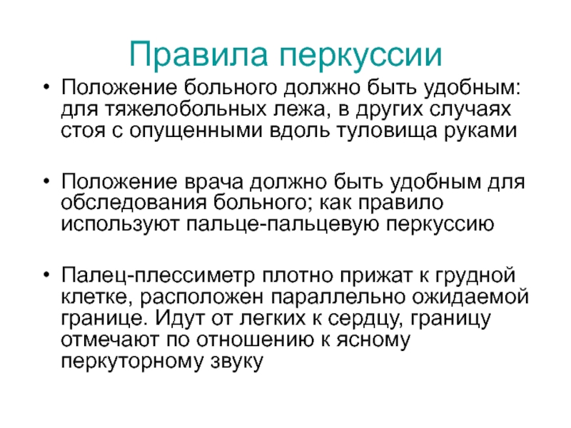 быть удобным для обследования больного; как правило используют пальце-пальцевую перкуссию