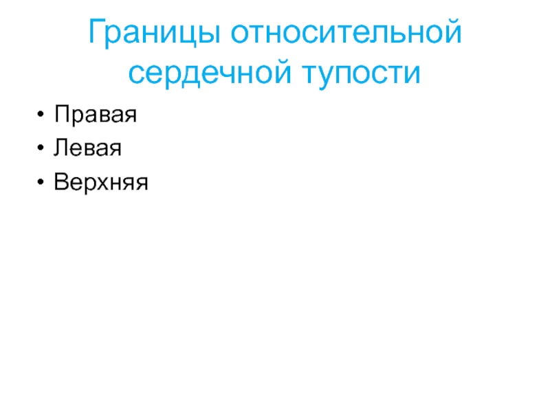 относительную сердечную тупость – участок, соответствующий истинным размерам сердца прикрытый легкими (притупленный перкуторный звук)
