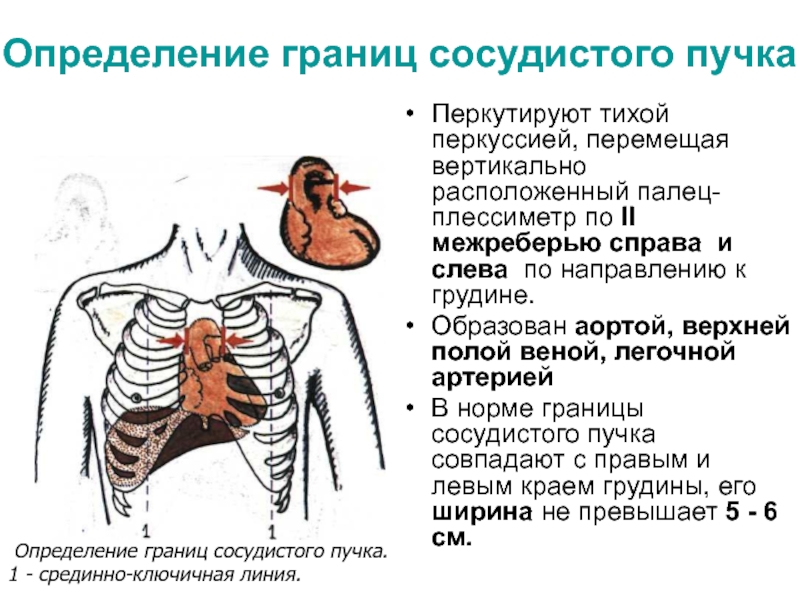 В норме границы сосудистого пучка совпадают с правым и левым краем грудины, его ширина не превышает 5 - 6 см.