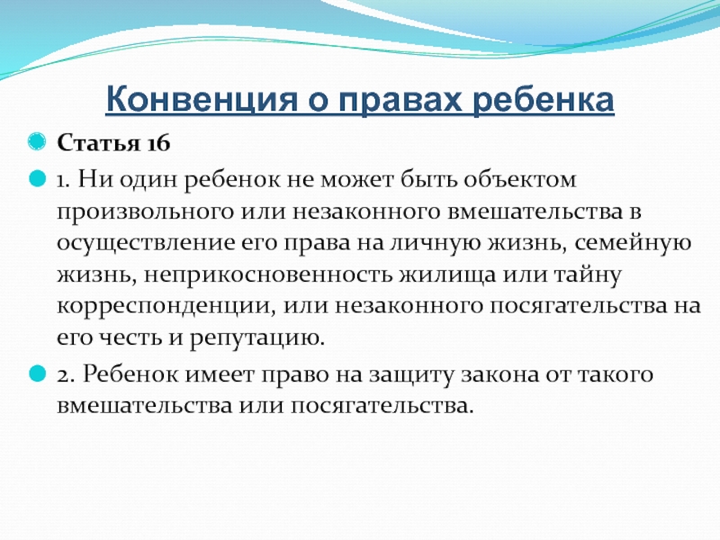 2. Ребенок имеет право на защиту закона от такого вмешательства или посягательства.